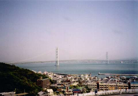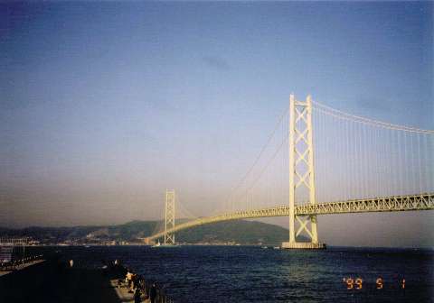 この写真は、夜が明けて目の前に現れた明石海峡大橋です。
